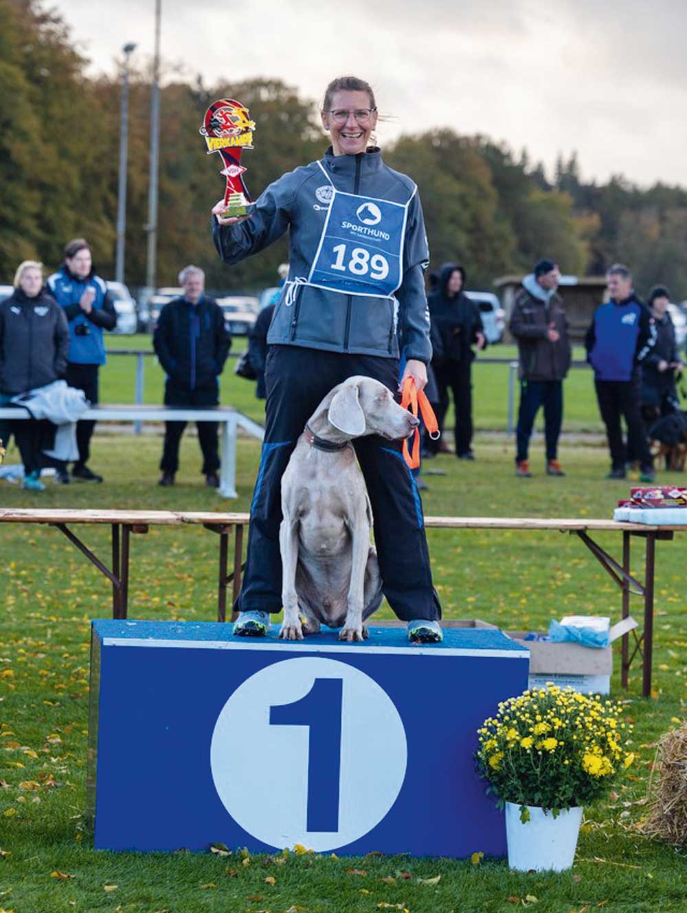 Am Samstagmorgen um 8:50 Uhr war Anika mit Janka mit ihrem 2000 m Geländelauf dran. Janka hat richtig Gas gemacht und nach 7:09 sec kamen sie ins Ziel und belegten am Ende Platz 14. Eine klasse Leistung. Wiebke mit Paula durfte um 10:12 Uhr mit ihrem Gehorsam starten. Paula hat wieder alle Übungen ausgeführt. Bei den technischen Übungen war sie etwas zögerlicher als sonst. Die Wertungsrichterin gab ihr 48 Punkte. Es war halt die deutsche Meisterschaft, da ist der Maßstab natürlich höher. Nadine und Shadow waren nachmittags dran. Schon auf dem Aufwärmplatz merkte man, dass das heute ein hartes Stück Arbeit wird. Shadow war voll „on fire“. Er durfte wegen einer Nagelbettgeschichte in den letzten 14 Tagen nicht trainieren. Im Ziel hatten sie zwar keine gute Zeit aber „nur“ 2 Fehler. Für die heutige Situation das Bestmögliche. Beim Slalom war Shadow voll da. Bei dem Superlauf blieb die Uhr bei 16:68 sec stehen. Das war die schnellste Zeit bei den Seniorinnen. Auch der anschließende Hindernislauf in 11:86 sec war der schnellste im Feld und auch fehlerfrei.
