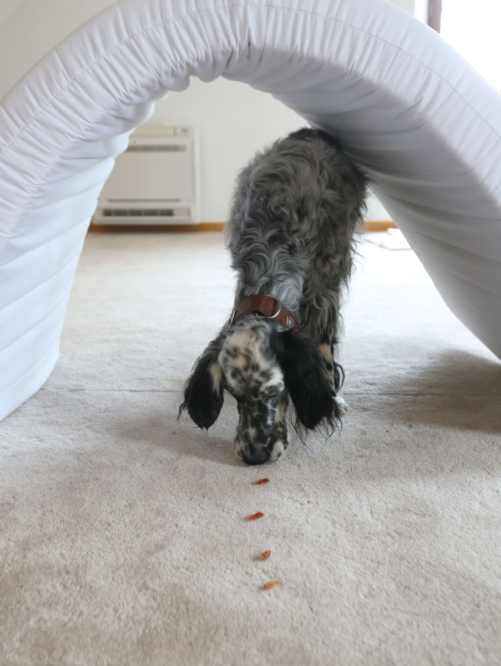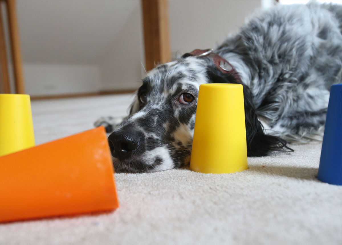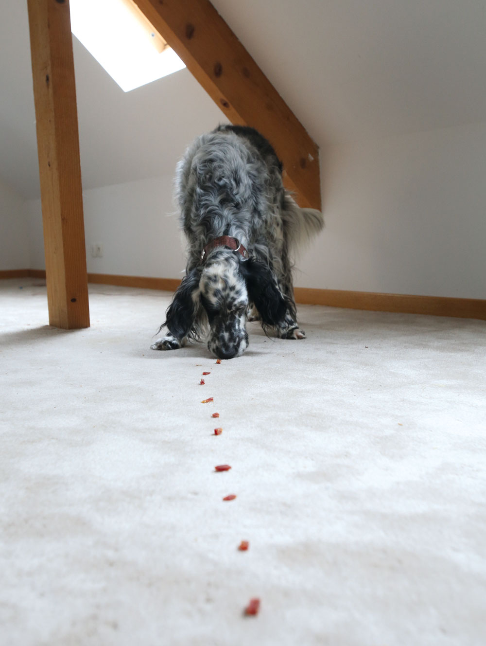 Hunde mit einer feinen Nase lieben es, diese auch einzusetzen. Deshalb eignet sich für sie jede Indoor-Beschäftigung, die das Geruchsvermögen herausfordert. Die einfachste Übung ist das Legen einer Leckerchen-Fährte. Abhängig von der individuellen Nasenleistung des Vierbeiners können die Leckerchen in kurzen oder in größeren Abständen gelegt werden. Nasenprofis erspüren die Leckerbissen sogar, wenn sie sich nicht in Sichtweite befinden. Auch Schnüffelspiele sind prima geeignet, um den Hund bei schlechtem Wetter im Haus oder der Wohnung zu beschäftigen. Mithilfe eines Handtuchs oder einer Decke lässt sich im Handumdrehen ein kleines Schnüffelparadies erschaffen. Einfach einige Leckerchen in den Stoff einschlagen, das Handtuch oder die Decke mehrfach falten und den Hund zur Suche animieren. Wer Handarbeit liebt, kann auch eine Decke mit kleinen Täschchen benähen und die Leckerchen darin verstecken.