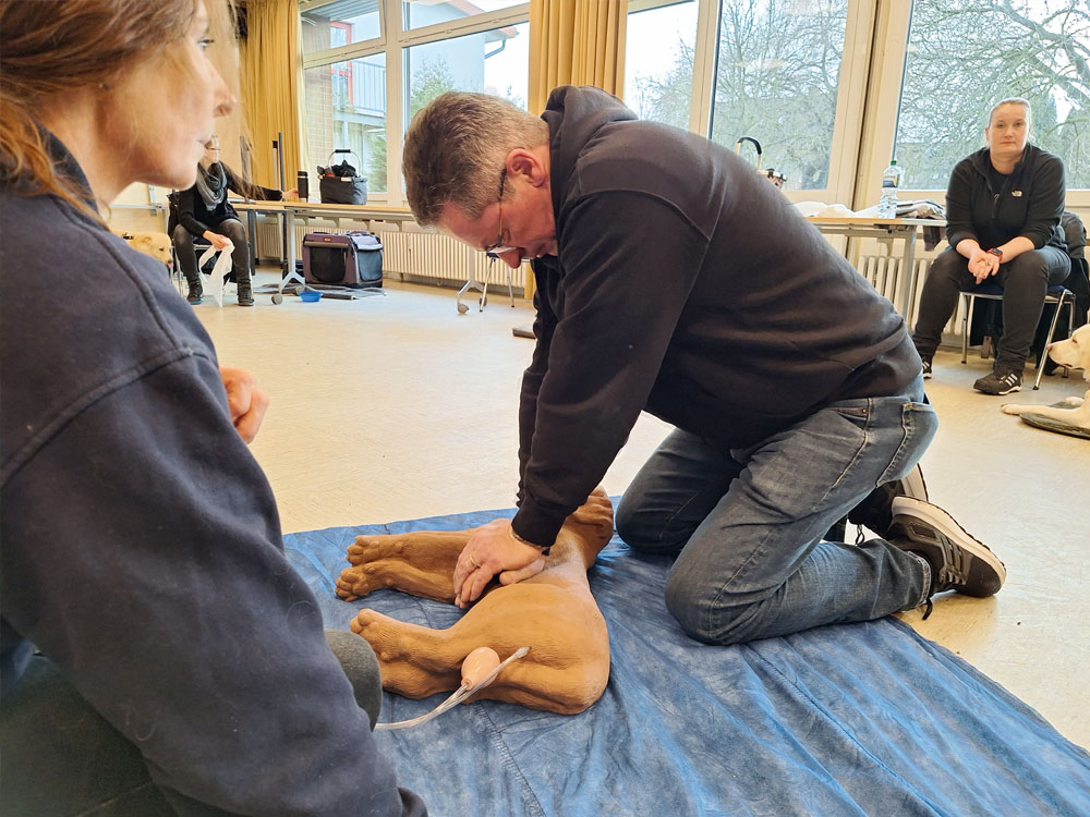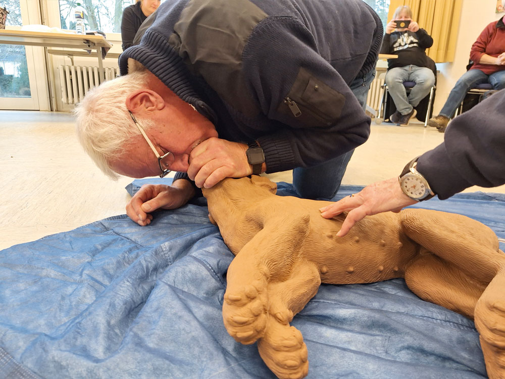 Letztendlich mussten dann noch alle Teilnehmer an den Dummys demonstrieren, wie die zuvor von Gabi erklärte Herzdruckmassage und die Beatmung bei den Hunden funktioniert. Auch das einmalige „Schlagen“ auf das Herz wurde trainiert für den Fall, dass der Hund einen Herzstillstand hat. Hier zeigte sich, welche Überwindung es die Teilnehmer doch kostete, diesen Schlag auf einen Dummy vorzunehmen.