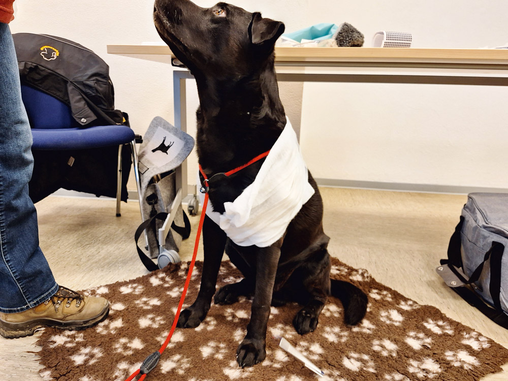 7 Hunde waren vor Ort und ließen sich unter anderem problemlos Verbände anlegen: Hier wurde zum einen ein Druckverband angelegt, aber auch gezeigt, wie man einen Verband anlegt, wenn der Hund beispielsweise in einen Nagel getreten ist und dieser noch senkrecht in der Pfote sitzt! Hatte jemand keinen Hund dabei, dann wurde an Dummys geübt. Es wurden also alle aktiv mit einbezogen.