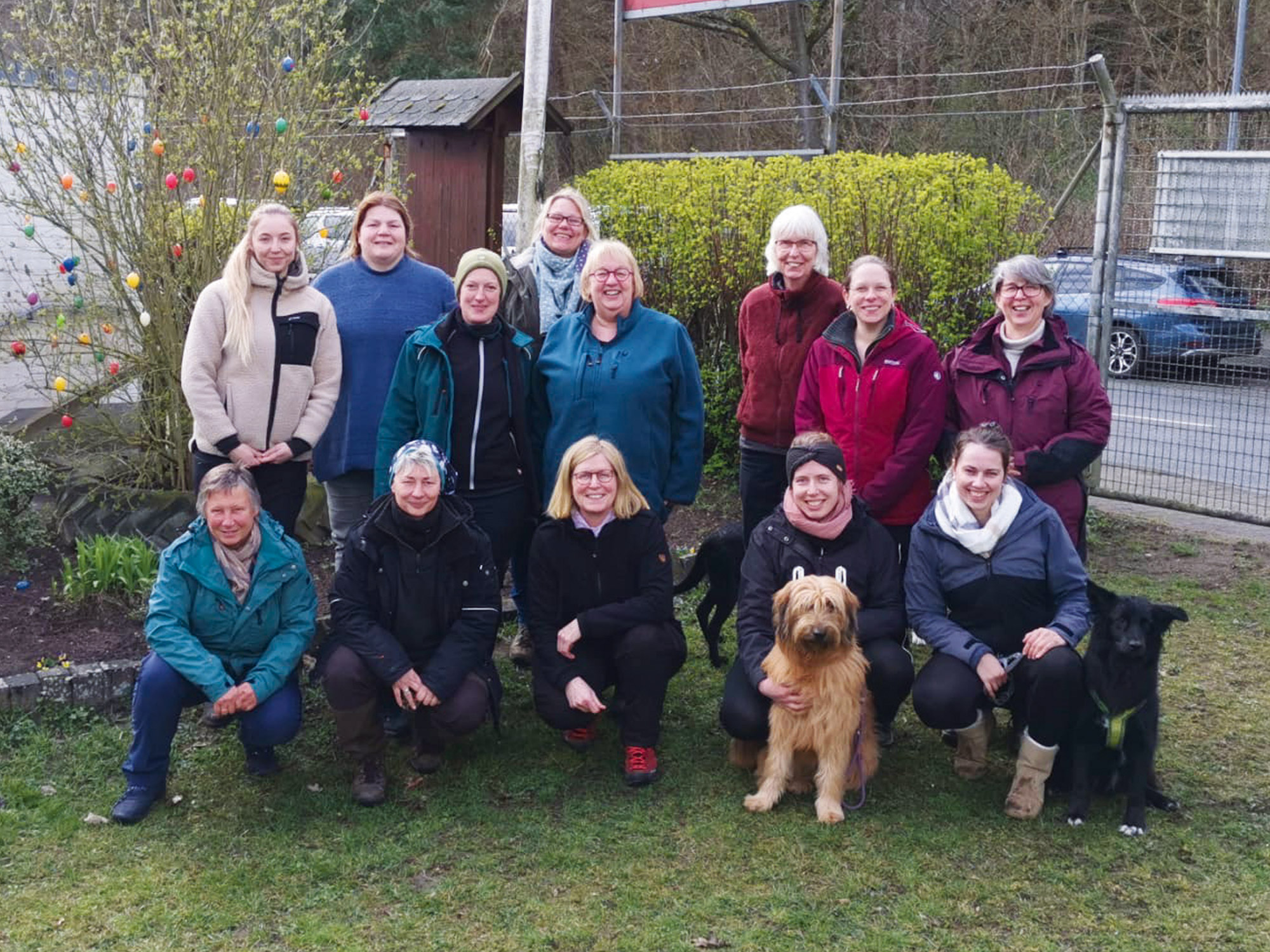 Am Sonntagvormittag starteten wir nach der Begrüßung und einer kurzen Frage- und Antwortrunde direkt mit dem Praxistraining auf dem Platz, und die Dreierteams stellten den 1. Teil ihrer Ergebnisse der Gruppe vor. Jede von uns hatte ihren Hund oder gleich mehrere mit, sodass wir uns mit unserem vierbeinigen Trainingspartner in den Gruppen ausprobieren konnten. Dabei gab es konstant sehr konstruktiven Input von Elke, die allen Teilnehmerinnen mit Sicherheit das eine oder andere Aha-Erlebnis beschert haben dürfte.