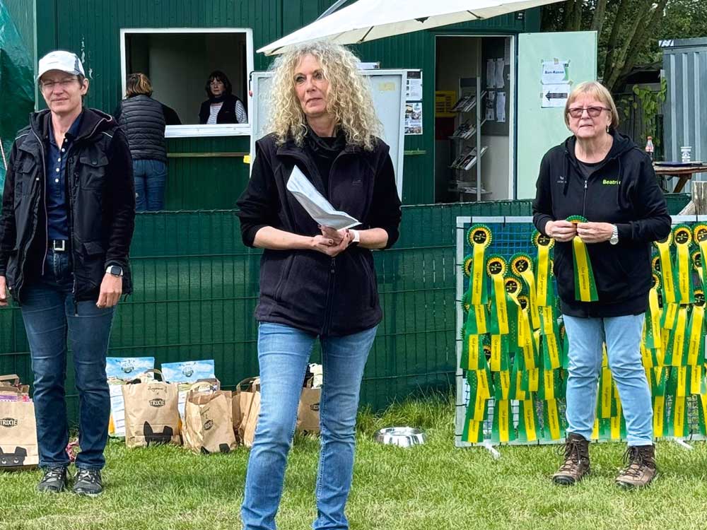 Der Wertungsrichter, Dirk Lippmann, RO-Beauftragter des Landesverbandes Hessen/Rheinland-Pfalz, und die Richteranwärterin, Sabine Hastenrath, sowie die Prüfungsleiterin Claudia Krake freuten sich nicht nur über das mit 60 Teams aus mehreren Bundesländern ausgebuchte Turnier, sondern auch darüber, dass der Wettergott ein Einsehen hatte: Zwar war es recht böig, aber es schien durchgängig die Sonne bei Temperaturen knapp unter 20 Grad – also ideale Bedingungen für die in den fünf Klassen startenden Teams. Als Resümee eines langen Turniertages stellte die Prüfungsleiterin fest: „Wir haben uns sehr viel Mühe gegeben, die Rahmenbedingungen optimal zu gestalten. Ich denke, das ist uns dank des Engagements unserer kompletten RO-Sparte sowie vieler weiterer Vereinsmitglieder auch ganz gut gelungen.“ Auch die Teilnehmenden selbst waren voll des Lobes. „Nicht nur der Zustand des Parcoursplatzes war vorbildlich, sondern auch die Verpflegung! Wir haben uns bei den „Flinken Pfoten“ sehr wohl gefühlt und den Tag genossen!“, so eine Teilnehmerin.