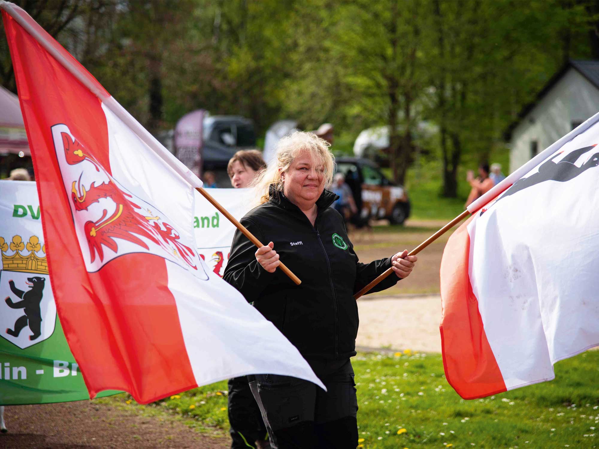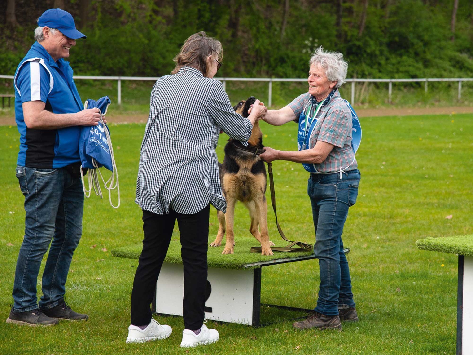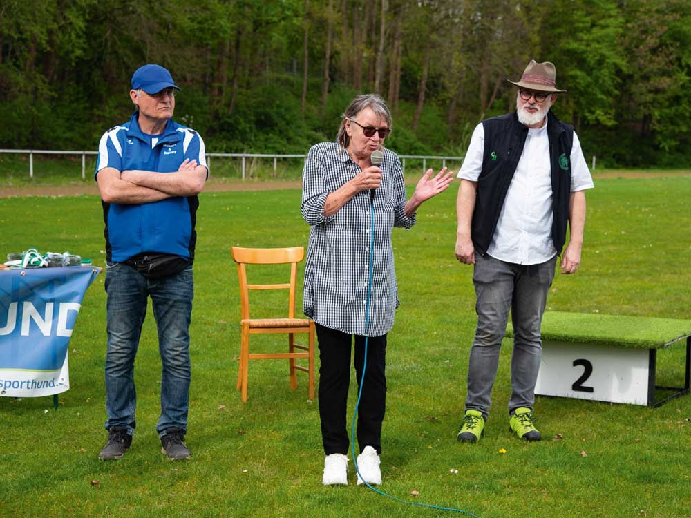 Am Sonntag wurde dann auf der Platzanlage weitergemacht, mit Unterordnung und Gewandtheit. Leider hatten nicht alle Prüflinge die Nasenarbeit bestanden, sodass diese Teams nicht mehr zur UO und Gewandtheit antraten. In einer längeren Pause wurden dann die Sieger festgestellt und die Wartezeit bis zur Ankunft der Bürgermeisterin Gaby Schäfer und anschließender Siegerehrung mit vielen Gesprächen und leckerem Essen und Trinken überbrückt. Die Ankunft der Bürgermeisterin war dann das nächste Highlight. Mit großer Empathie und Herzlichkeit ging sie, als Hundefreundin bekannt, auf Hund und Hundeführer zu und sprach mit vielen Teilnehmern, streichelte Hunde wo immer auch einer stand. Beim Einzug der Teams auf den Platz war sie ebenfalls begeistert, wie toll dies wäre und super organisiert. Eine sehr schöne Rede hatte sie auch noch vorbereitet und sprach auch von der Wichtigkeit der Veranstaltung und der Arbeit der Hunde. Bei der Siegerehrung ließ sie es sich nicht nehmen, allen Siegern herzlichst zu gratulieren. Besonders der kleinste Sieger, ein Jack Russell, hatte es ihr besonders angetan. Nochmals ganz herzlichen Dank an Frau Bürgermeisterin. Alles in allem war dies für uns eine anstrengende, aber aufgrund der vielen Erlebnisse und Erfahrungen, unvergessliche Woche. Wir haben alte Freundschaften wiederaufleben lassen und neue Freundschaften geschlossen, tolle Gespräche geführt und festgestellt, dass RH Sportler und RO/THS Sportler sehr gut zusammenpassen. Was noch positiv auffiel war das, obwohl viele Hunde vor Ort waren, es erstaunlich ruhig war. Kein Hund war aufgedreht, zur Freude der Nachbarn gab es kaum lautes Gebelle. Zum Schluss möchte ich noch dem blauen Team vom HSV Bochum Eppendorf danken, welches sich unermüdlich in die Arbeit gestürzt hat, um unsere Gäste zu bewirten. Ganz herzlichen Dank dafür.