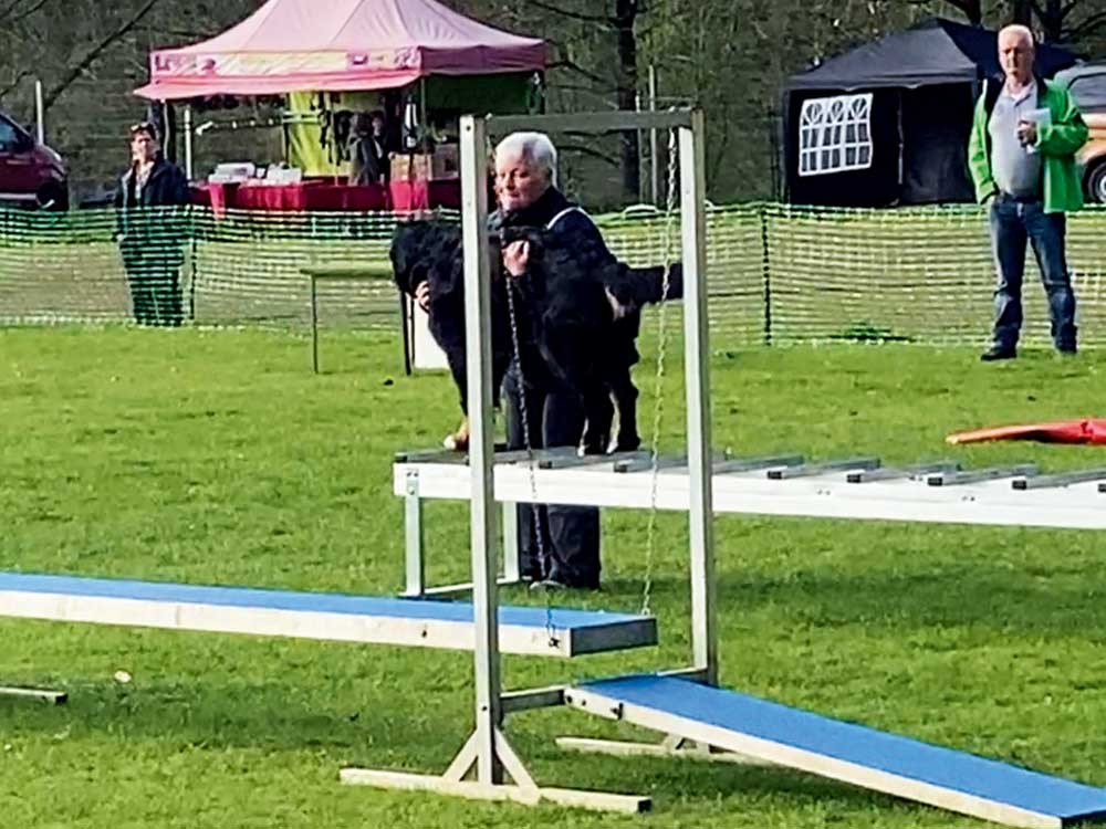 Hier musste der Hund verweilen, bis er zum Hundeführer abgerufen wurde. Auch wenn die Augen der Hunde scheinbar was anderes sagten, ließen es sich ausnahmslos alle klaglos gefallen und kehrten dann auf Abruf freudig zum Hundeführer zurück. Die Übungen auf den Geräten, waren die weiteren Highlights. Als erstes die Schaukel. Unglaublich wie geschickt die Hunde, ob groß oder klein, hier auf der sehr langen und wackeligen Schaukel liefen, um an das entfernte Ende zu kommen, und hier zu warten bis sie auf das Kommando Fuß heruntergerufen wurden. Auch die lange waagerechte Leiter stellte für die geschickten Hunde kein Problem dar. Laufen bis an die letzte Sprosse und warten bis der Hundeführer den Hund herunterträgt und absetzt. Kein Thema für die Hunde. Selbst der lange Tunnel, der bis zur Mitte rund und am Ende platt auf dem Boden lag, wurde von allen Hunden ohne Probleme durchlaufen, obwohl es dort drin aufgrund des sonnigen Wetters bestimmt unangenehm warm war. Aber dann war es geschafft und der Prüfungsteil UO und Gewandtheit war für das Team geschafft. Nun war das zweite Team aus der Ablage an der Reihe, um die gleichen Übungen zu machen. Nun gab es per Lautsprecher, die ausführliche Besprechung und Bewertung der beiden Leistungen durch die estnische Leistungsrichterin. Diese wurde noch vom Englischen ins Deutsche übersetzt. Für manches Team ging es dann nachmittags weiter zur Nasenarbeit (Trümmersuche in Leverkusen oder Flächensuche in Essen bzw. Fährtensuche in Bottrop-Kirchhellen). Umgekehrt waren dann ein paar Teams die vormittags Nasenarbeit gemacht hatten, nachmittags mit der UO und Gewandtheit an der Reihe.