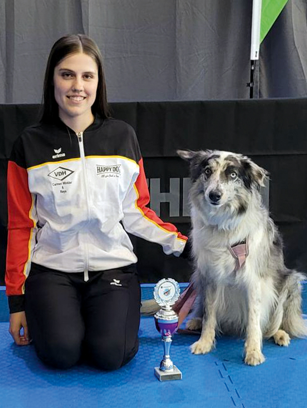 2 Jahre lang führte Carmen beide Hunde in Freestyle 3, Cita ging dann Ende 2023 in „Rente“. In den ersten Starts in Klasse 3 konnte sich das Team noch nicht mit der Spitze messen, aber 2022 kam der Durchbruch: Qualifikation zur WM 2024 in Dänemark, dann Platz 27 in einem unglaublich starken Teilnehmerfeld! Eine starke Leistung für Carmen und Reya, die seitdem im VDH absolut auf internationalem Niveau tanzen. Den Reservestart an der WM 2024 in Budapest nutze Carmen ganz gezielt als Atmosphärentraining für Reya, die sie mittlerweile auch in Heelwork to music ausbildet.