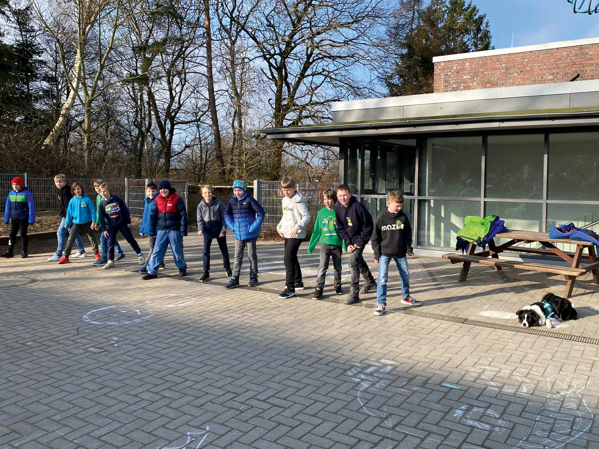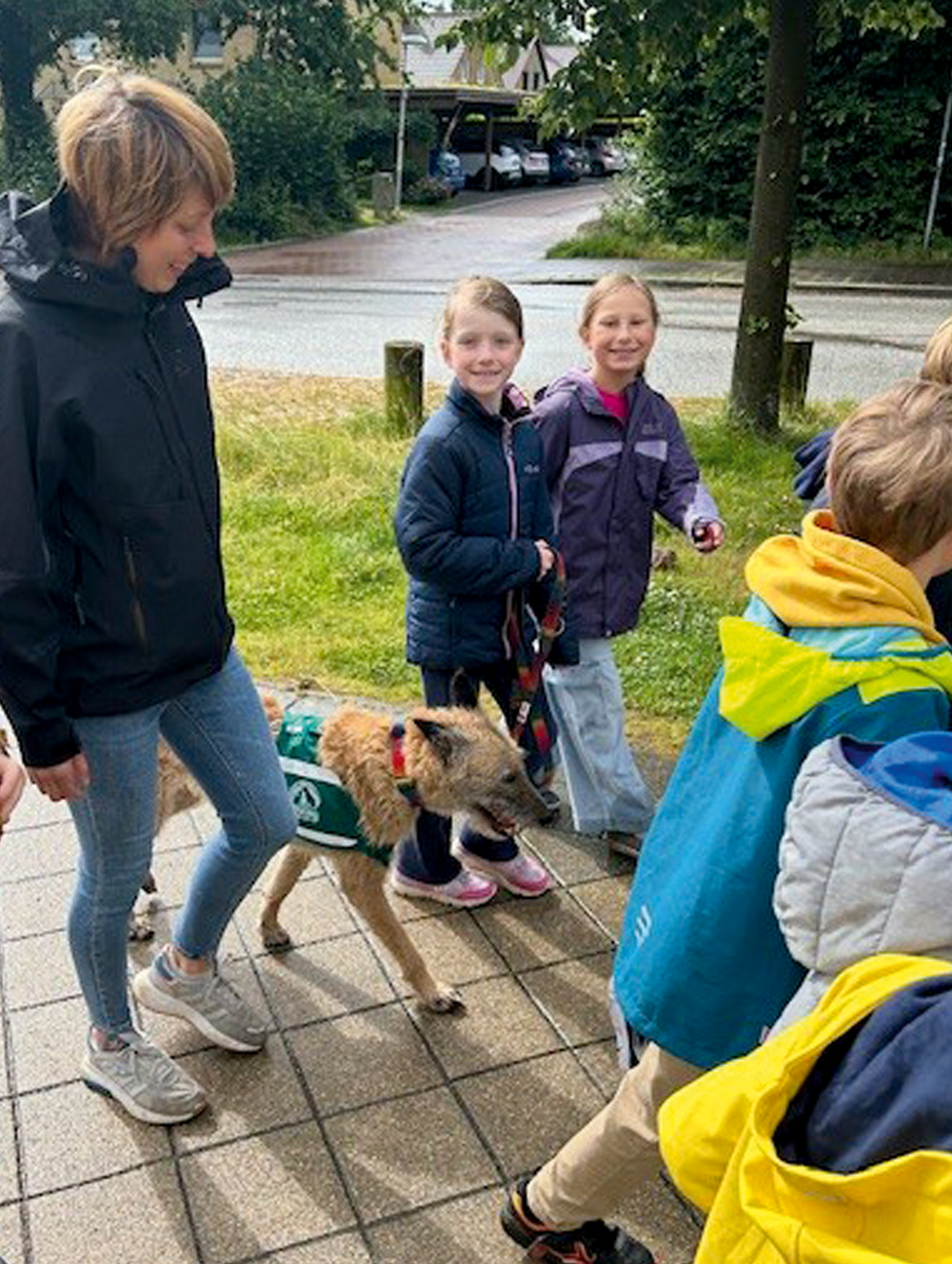 Dani hatte im März mit ihrer Border Colliehündin Fibi gemeinsam mit Twain und mir ihren ersten Einsatz an der Johanna-Mestorf-Schule. Zuerst übten wir mit den Kindern das Begrüßen beim fremden Hund und wiederholten einige Regeln aus der Broschüre. Beim anschließenden Wettrennen Viertklässler gegen Fibi wurde schnell deutlich, warum man nicht versuchen sollte, vor einem Hund davonzulaufen. Fibi gewann deutlich und Twain schaute zu, da er meistens neben den Kindern hertrabt statt wirklich Gas zu geben … Zum Schluss gingen wir noch eine Runde spazieren und die Kinder konnten nacheinander einen der Hunde an der Leine führen. Währenddessen war auch Zeit für Fragen oder Erzählungen der Kinder.