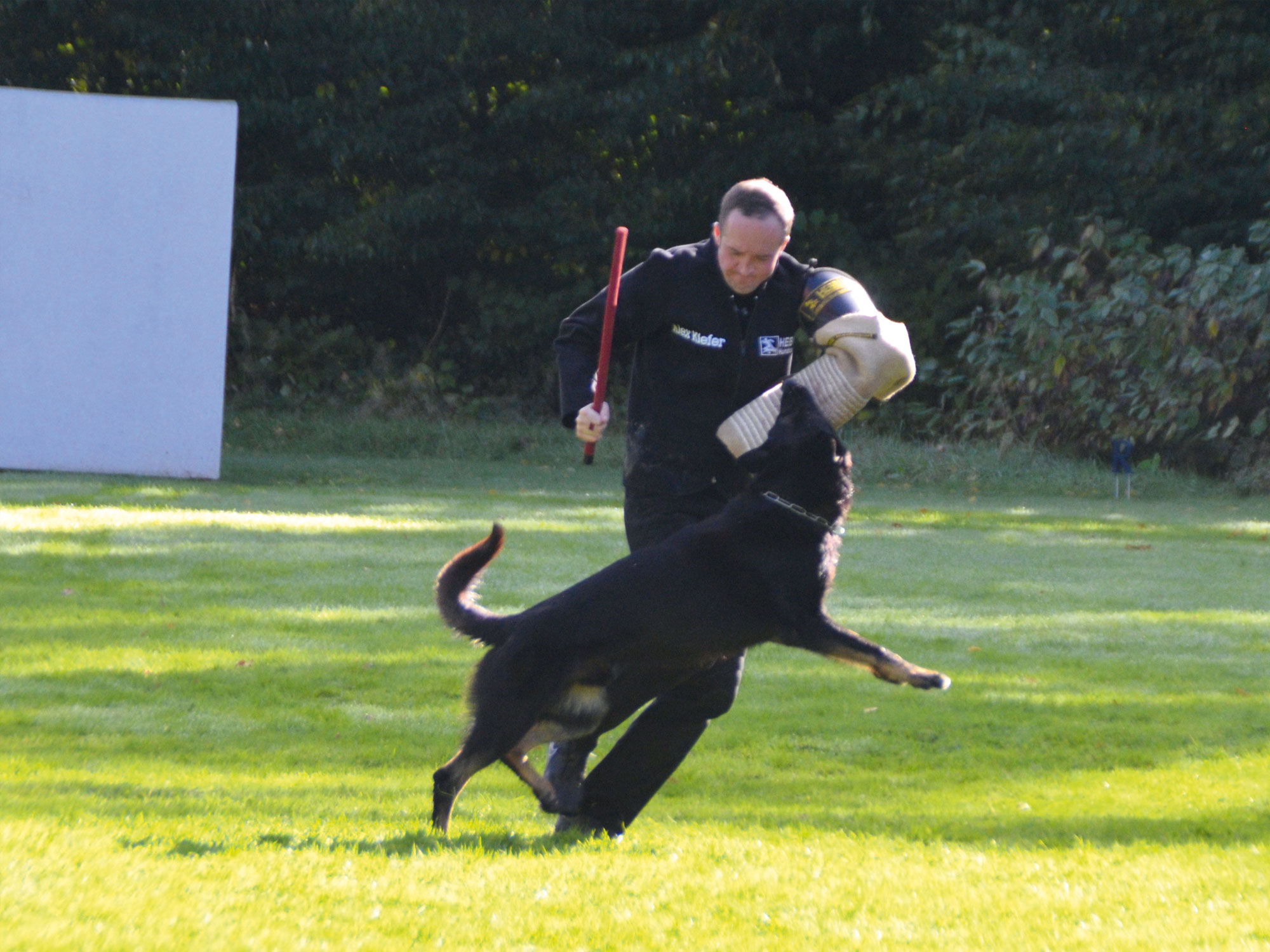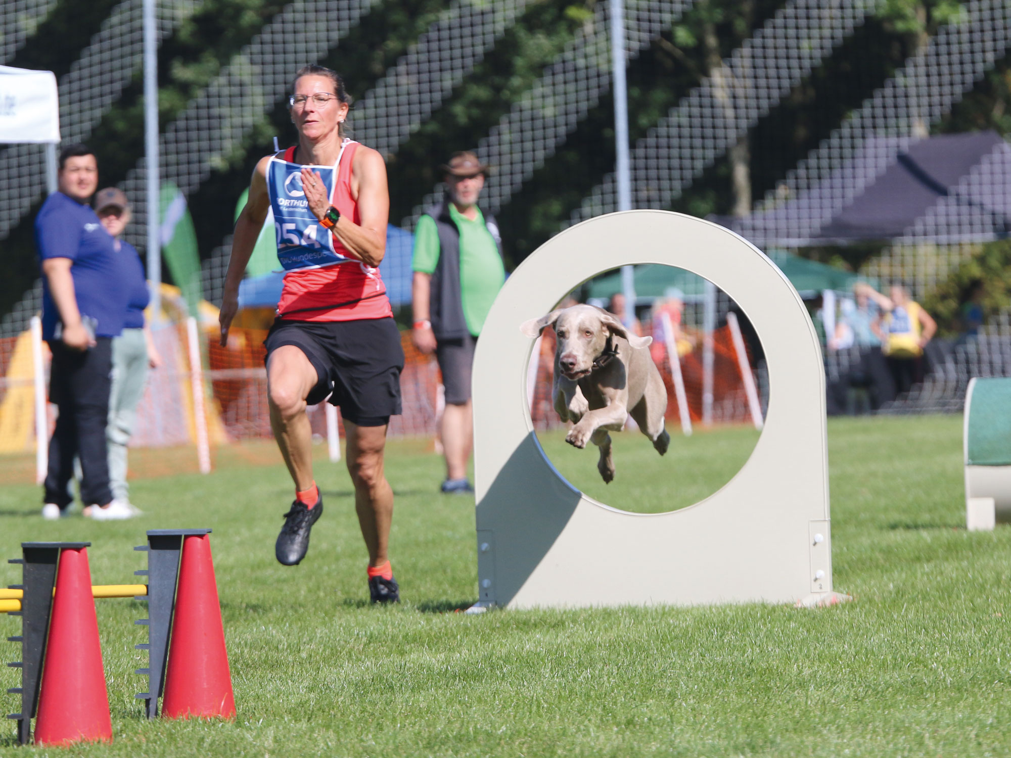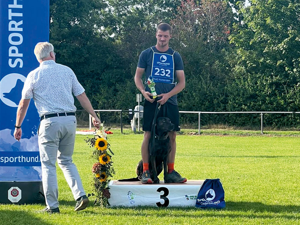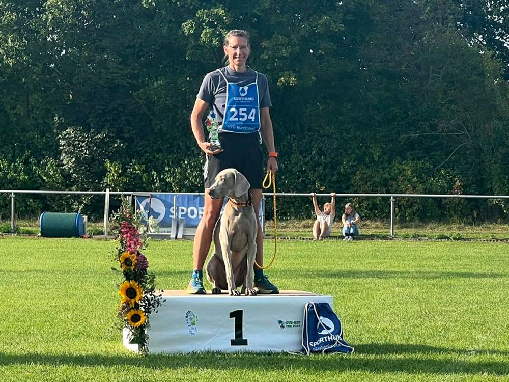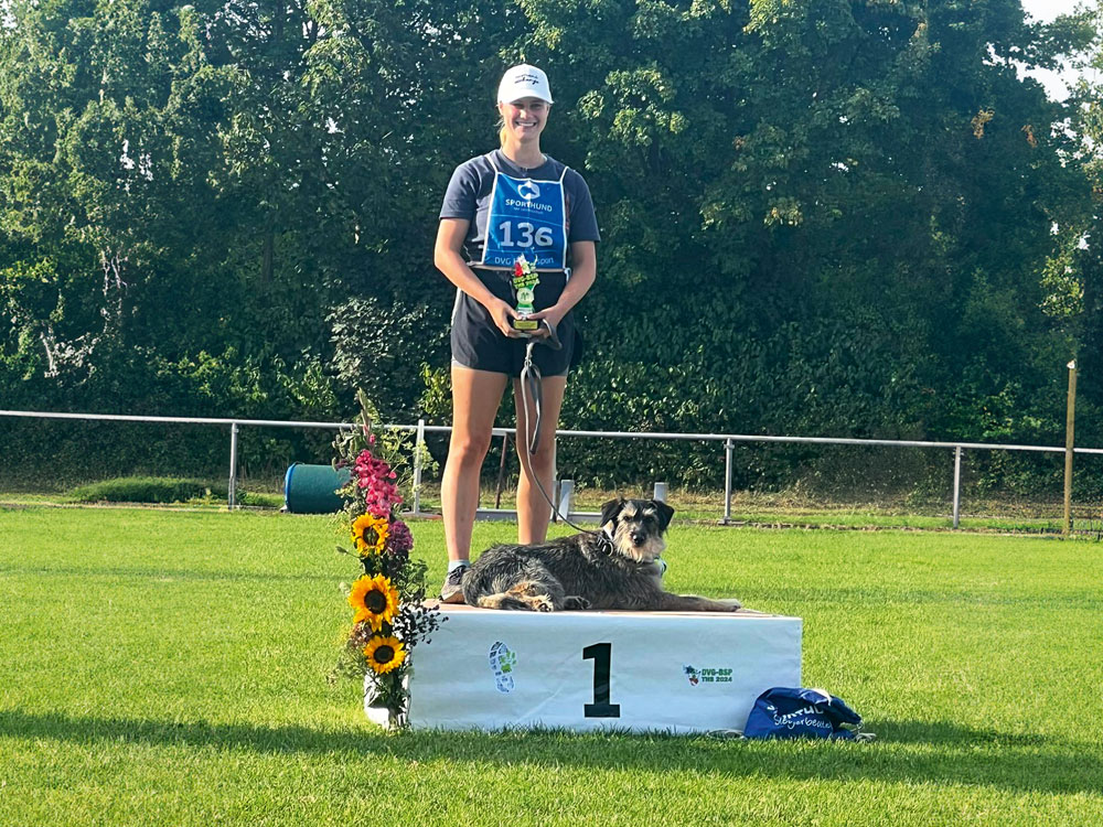 Danach ging es für Verena & Mila, Mario & Laika und Nadine & Shadow in die Laufdisziplinen des Vierkampf-Sprints. Für Verena und Mila war es ebenfalls der erste Start auf der BSP. Sie starteten in der starken Klasse AK19 mit 19 Starterinnen. Die beiden haben sichere und fehlerfreie Läufe gezeigt. Das ist gerade auf einer BSP nur möglich, wenn beide im Team zusammenarbeiten und alles geben. Mario und Laika haben im Frühjahr erst mit THS begonnen. Daher waren beide ein wenig beeindruckt vom ganzen Drumherum einer Bundessiegerprüfung. Bei den Hürden hatte Mario einiges zu tun, dass Laika beim Sprung auf Höhe blieb. Daher war die Zeit nicht ganz so schnell wie sonst. Eine Stange ist gefallen und insgesamt 6 Fehler haben die Zwei erhalten. Volker und Jessica, unsere Mannschaftsführer und guten Herzen, haben Mario wieder aufgebaut und auf die nächsten 2 Läufe vorbereitet. Beim Slalom ging er auf Sicherheit. Auf jeden Fall null Fehler sollten her. Das haben sie geschafft. Dann kam der Hindernislauf. Die zweite Lieblingsdisziplin der beiden. Dort haben sie ebenfalls null Fehler und in ihrer AK den schnellsten Lauf in 9,39 Sek. hingelegt. Das war mega! Als letztes Team an diesem Tag waren Nadine und Shadow am Start. Der Hürdenlauf lief nicht ganz so rund und es mussten kurze Stopps eingelegt werden. Ziel waren die null Fehler am Ende. Durch die Stopps war die Zeit nicht ganz die gewohnte, aber die null Fehler standen. Im Slalom hatte Shadow den Start ein wenig „verschlafen“. Aber er schloss schnell auf und beide konnten dann zusammen und zügig den Rest ohne Fehler absolvieren. Zum Schluss ging es zum Hindernislauf. Hier hieß es für Nadine renn, was du kannst, Shadow wird schon alles nehmen, auch den Durchsprung. Und ja, er hat selbst verzögert, damit er nicht dagegen knallt. Hier hatten die zwei in ihrer AK die schnellste Zeit in 11,75 Sek. Für die drei Teams hieß es jetzt warten auf die Zeiten, wann sie am Sonntagmorgen im Geländelauf starten werden.