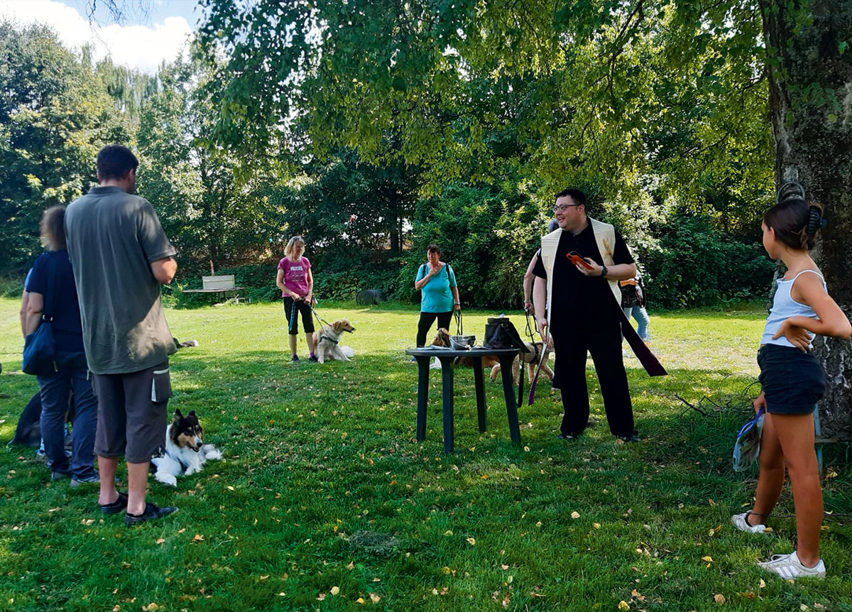 Pfarrer mit Teilnehmer*innen an der Hundesegnung
